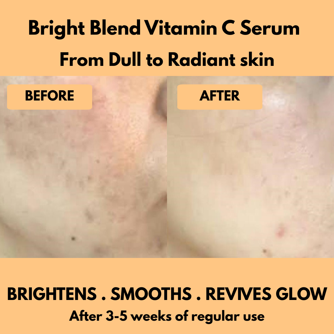 Our Bright Blend Vitamin C Serum features 12% encapsulated 3-O ethyl ascorbic acid for potent brightening, complemented by hydrating 1% hyaluronic acid and 3% alpha-arbutin for an even, radiant complexion. It also includes the powerful antioxidant ferulic acid, creating a blend that ensures deep hydration and effective brightening for all skin types.